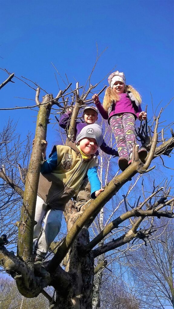 3. Wspinanie się na drzewa. Dzieci kochają wyzwania, a wspinanie się na drzewa to jedno z nich. Choć może wydawać się to niebezpieczne, warto pozwolić dziecku na samodzielne pokonywanie trudności. To daje poczucie niezależności i pozwala na eksplorację własnego ciała w przestrzeni. Dziecko uczy się oceny odległości, wysokości i planowania ruchu. Patrząc na świat z góry, nabiera odwagi i pewności siebie. Ponadto, to doskonały sposób na wzmocnienie mięśni i poprawę koordynacji ruchowej. Psst! Sprawdź nasze ubrania sensoryczne!